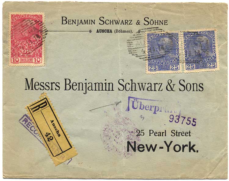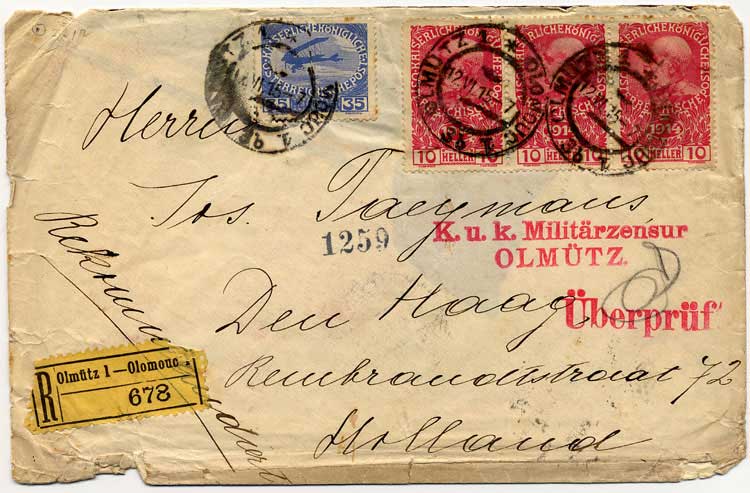 7. Registered cover to Holland franked with 17 of the 3 heller second issue, ie 51 heller instead of the required 50, from November 1915.
