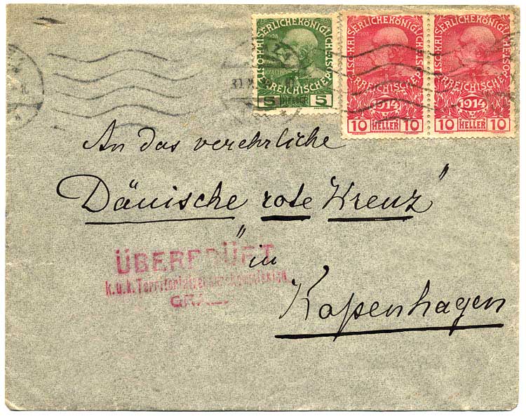 ANK 178-179 are the War charity (widows & orphans) stamps, issued 4.10.1914, valid "for internal use only" until 30.6.1915. Values 5 and 10 Heller were sold at 7 & 12 ie at a 2H surcharge. Complete sheets of 80 received a discount of 20H for 5H, 25H for 10H; in addition the postal officials received 5H for each sheet sold. The result was that instead of paying 80 x (5H + 2H) = 5Kr60 for a sheet of the 5H and 9Kr60 for the 10H, the post office remitted to Head Office only 5Kr35 and 9Kr30. Although the Decree authorising this issue stated "for internal use only", covers without postage dues or invalid marks are known used to Sweden, Switzerland, Holland and the USA. The design was basically the 1908 definitive made taller, with '1914' and a filling of laurel twigs inserted between the portrait and the value. It was done by Prof Koloman Moser; printed on ordinary paper by typography in sheets of 80; comb perf 12.5 Quantities printed: 5H 17,599,968; 10H 17,440,500. About 3 million 5H and 2 million 10H remained unsold on withdrawal; a few were sold via the Collectors' Counter in Vienna but the rest remained when the war ended. A variety of proofs and colour trials exist.