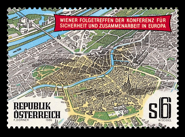 This map shows the plan; it is about 45º clockwise to the previous one. Note the large open area to the left: this was retained for military exercises for many years, until released for the construction of the Town Hall. The Linienwalle show up well! It’s interesting to compare the map with this "birds eye view" stamp issued for the European Conference for Security and Cooperation in Vienna on November 4, 1986