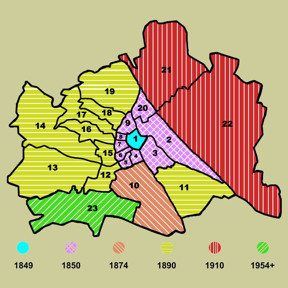 This map shows the expansions; the Bezirke boundaries and numbers are shown, taken from a 2000 map. The Anschlüß period has been ignored.