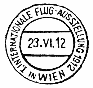 The official opening of the airport took place simultaneously with the International Aviation week in Vienna from June 23 to June 30, 1912. The description 'International' was well justified, with more than half of the 44 participants coming from abroad, eg France, Germany, Italy, Rumania, Russia, Switzerland and even from Peru. However, a substantial portion of the quite generous prizes went to Austrian aviators. The factors for judgement included altitude, speed, ascent, circling and landing. There was a first prize for 4300 meter altitude with one passenger: or 201.8 km distance. Austria scored 23 world records and finished closely behind France and well ahead of the USA and Germany. The cancel illustrated is from the special exhibition post office.
