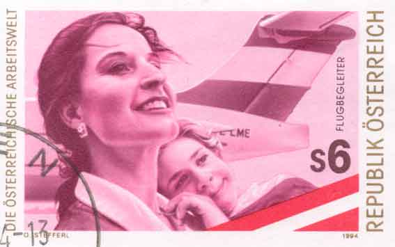 In March 1977 Aspern was finally shut down, for the airfield lay exactly below the approach path for the second, 3600 m long, Vienna-Schwechat runway. The development of Austrian Airlines and of Schwechat continue, as do the philatelic links. The first stamp below [ANK2172: 18.11.1994] shows an Air Hostess; the second one [ANK2211: 28.3.1996] the West Pier extension of the Schwechat terminal opened in 1996.