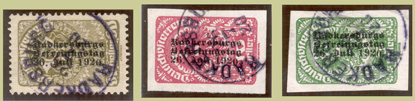 On about half the issues the final s in Spielfelds of the 3-line overprint is missing because of a failure of the primitive hand-stamp. The private commemorative cancellation was done with a circular rubberstamp supplied by the Liberation Committee with "Spielfeld / Befreiung" around the circumference and the dates "8.8.20" and "29.7.1920" across the centre.