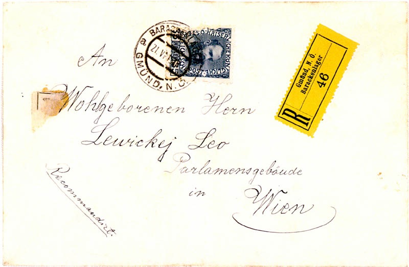 Figure 22. Registered letter mailed to "Lev" Levitsky, the senior Ukrainian member in the Austrian Parliament, on 21 June 1915. Since this was not an official dispatch, full postage was required: 15-heller letter rate and 20-heller registry. Note the Gmünd "a" cancel.