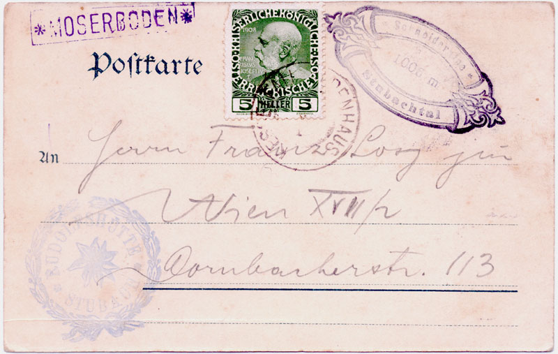 These two hotels were opened towards the end of the 19th century, and at first were served by an Austrian government post office in the Alpenhaus and a Postablage at Moserboden. Moserboden used the standard boxed * MOSERBODEN * Postablage mark from 21 July 1904. It is recorded from 1904 to 1914 in black and violet, and the office was supposedly open from 15 June to 15 Sept each year. It seems to have been closed during WWI, reopening in 1920 for a couple of years. Mail from it was carried by the postperson to Kesselfall Alpenhaus (where there was a summer Post Office) for franking.