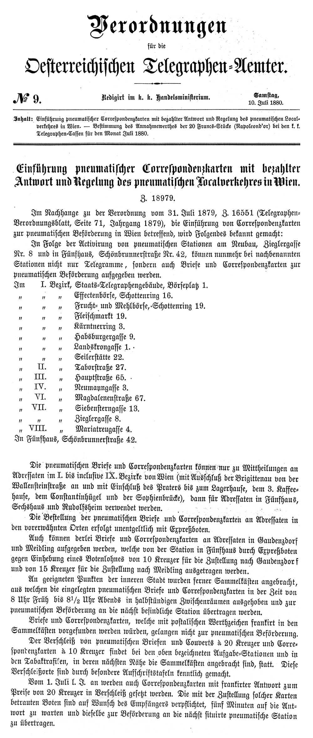 In the supplements to the ordinance of 31 July 1879, §16551 (Telegraphen=Verordnungsblatt, page 71, 1879) concerning the introduction of Correspondenzkarten for the pneumatic post in Vienna, the following is made known: In consequence of the opening of pneumatic stations at Neubau, Zieglergasse No 8 and in Fünfhaus, Schönbrunnerstrasse No 42, there can now be handed in at the undernoted stations not only telegrams but also letters and Correspondence-cards for pneumatic forwarding.