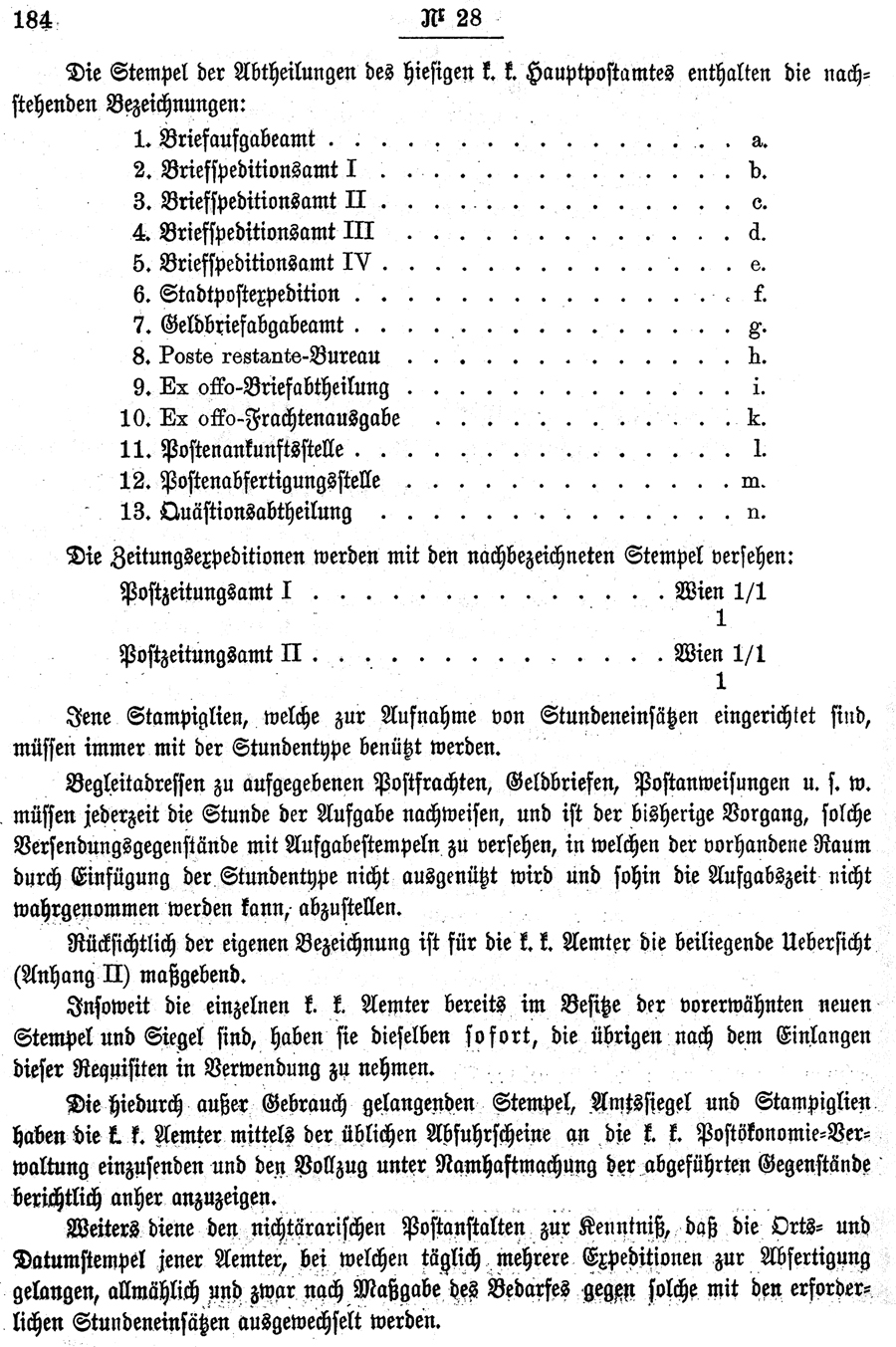 Die hiedurch außer Gebrauch gelangenden Stempel, Amtssiegel und Stampiglien haben die k.k. Aemter mittels der üblichen Abfuhrscheine an dir k.k. Postökonomie-Verwaltung einzusenden und den Vollzug unter Namhaftmachung der abgeführten Gegenstände berichtlich anher anzuzeigen.