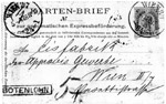 | ?? | Sent from Wien 15 1/1 at 11:50 on 10. VI.1890. Arrived at Wien 24 20/2 at 15:50 10.VI.1890 (month could be VII), then by messenger to Rotonde, Prater. |