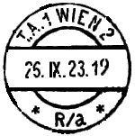 Examination of several collections has shown a somewhat different type of wording on bridge cancels, to which we have given a separate section. At the top is T.A., the postal district number, WIEN, & the pneumatic office number. In the centre is the day, month, year and time. At the bottom is R/a, usually flanked by stars. These have been found in the 1921-1938 period. The diameter is constant at any one office, but ranges from 26mm to 29mm from one office to another. "T.A." could mean "TelegraphenAmt". |