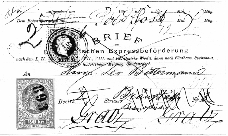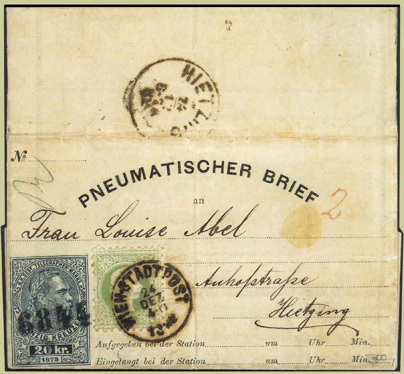 The example above is different: it was sent pneumatically to an address in Vienna [note the Central Telegraph Office number cancel (used March 1881 to January 1883) on the 20Kr imprint] then re-addressed to Graz.