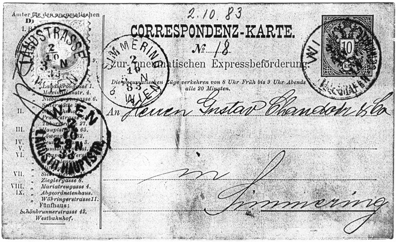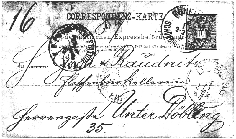 Posted in Schönbrunnerstrasse at 2-3pm on 3 November 1888; sent to Lazarethgasse (K K Pneu Stat XVI) then transferred to normal Post Office Döbling (arriving 5-6pm) for delivery.
