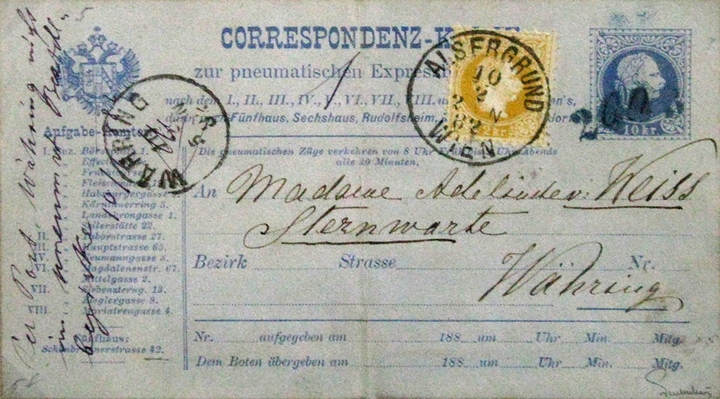 This started at the Central Telegraph Office (number cancel on the 20Kr imprint) and was sent to Wien 66, the pneumatic station at Alsergrund. From there it went by ordinary post or special messenger to the Wäring office. The delivery postman then had to climb up a not inconsiderable hill to reach the Sternwarte observatory, and hand it to Madame Weiss, the wife of the Director. This card was posted on 10 Feb 1882, at which date the Sternwarte observatory was outside the city limits of Vienna - hence the need for added franking. Wäring wasn't incorporated until 19 Dec 1890; before that it was in Lower Austria.