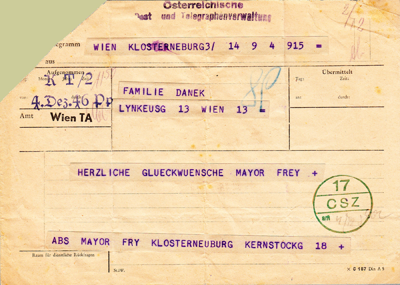 This was mailed from 7 WIEN xx / 23.VIII.46.11 / 7b [this is probably 7 Wien 60 (Stohl R0030e; open in 1946 according to Turner) or possibly 62 (Stohl R0031f; 1946-status unclear)]. It is addressed to Wien XX, Donaueschingenstrasse 30. Green 1851 Soviet Zone censorship marking; red crayon 129. The franking is 48 groschen. The censor marking is on top of the sealing tape and the label. On the front is "per Eilbote" in the same hand as the address on the front and the sender’s name (& address in Durnstein!) on the back.