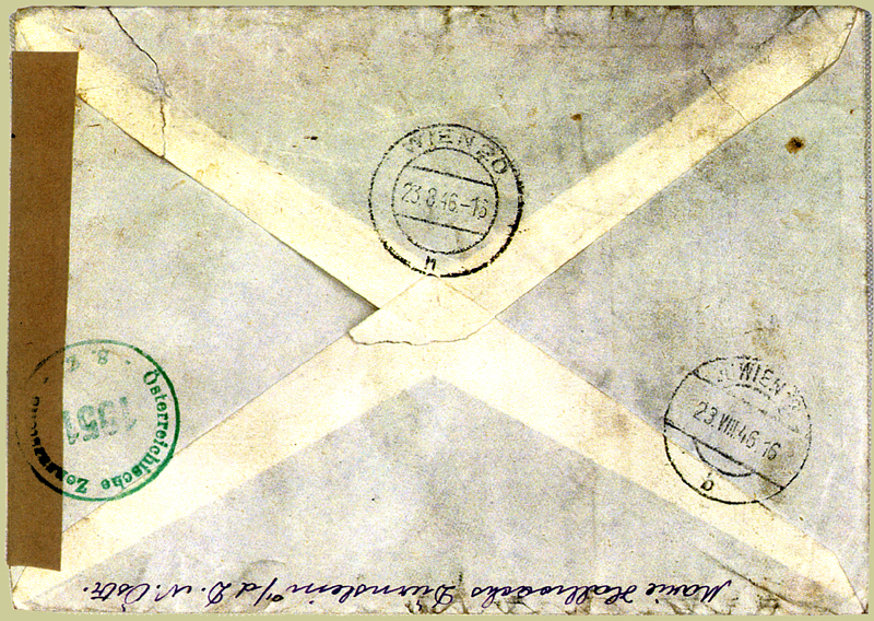 On the back is another green 1851 censor mark, also on top of the sealing strip, and two cancellations: a ring cancel WIEN 20 / 23.8.46.-16 / h (this is Stohl’s A2625h) and a bridge 20 WIEN xx / 23.VIII.46.16 / b. Given the delivery address, WIEN 129 in Webergasse is a sensible pneumatic office to send it to, and it is listed as being open in August 1946. The bridge cancel would then be 20 WIEN 129 (which is Stohl’s R0059g although he records its first usage in 1947)