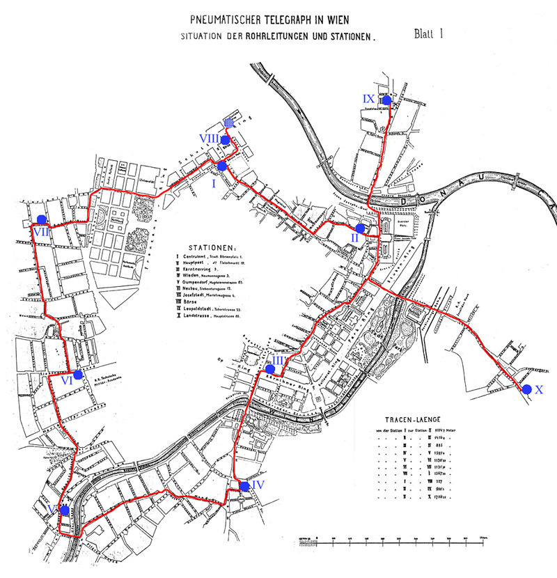 The Zeitschrift für Post und Telegraphie for 20 Jan 1900, in an article headed "25th Anniversary of the Vienna Pneumatic Post", says "… the heart of the system was the Central Telegraph Building, Station I. The pipe ran thence to the Laurenzergebäude in Fleischmarkt (Station II), from there... to Kärntnerring (Station III), out to Wieden (Station IV), then through Margareten to Gumpendorf (Station V)... to Neubau (Station VI) and Josephstadt (Station VII) and completed the circle at its point of commencement. From Laurenzergebäude two branches ran to Leopoldstadt (Station IX) and Landstrasse (Station X) and similarly from the Centrale a branch ran to the Börse (Station VIII)".