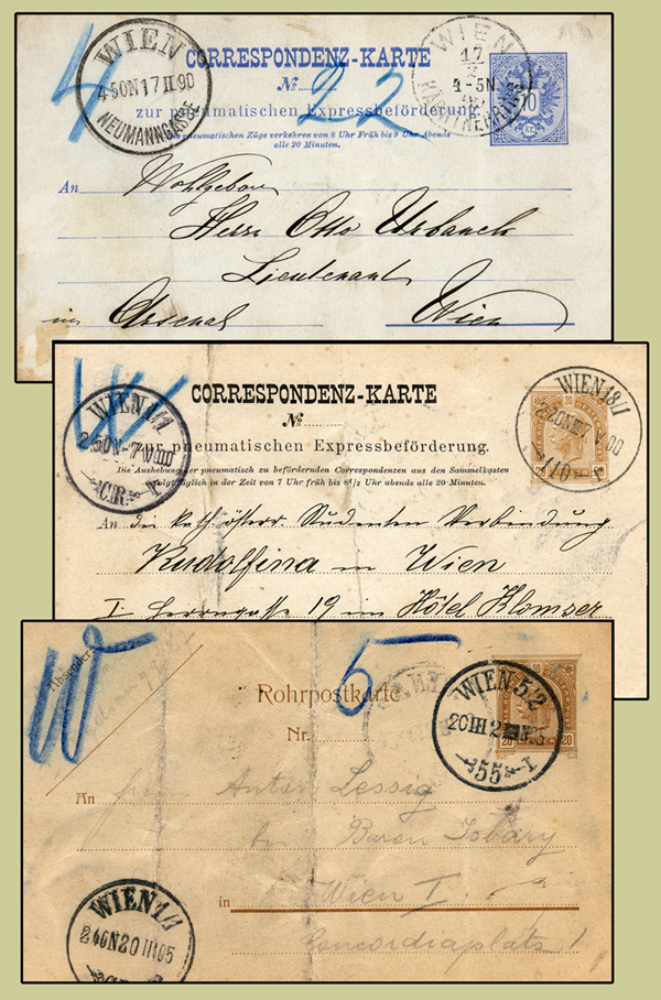 So summarising (and anticipating the expansions), each item sent through the pneumatic system was marked at top left with the number of its destination station. Until the 1892 renumbering of the Viennese Post offices, these were allocated in order-of-construction; from 1892 they were the new Post Office number. During the changeover, the staff sometimes used the old numbers out of habit; and sometimes a new-number letter canceller was used because the new-number pneumatic canceller hadn't been delivered.
