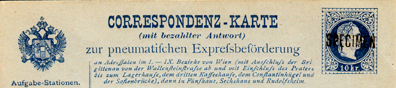 Special postcards for the Pneumatic Post were introduced in 1879; they cost 10Kr only, and rapidly overtook the envelopes in popularity, soon rising to 90% of the traffic. Reply-paid cards were brought into use in 1880. These were the normal postcard with a pre-stamped reply section attached and carried the inscription "The messenger is allowed to wait 5 minutes for the answer". The first two Pneumatic Post cards to appear, incidentally, were inscribed "delivery is free" - which has been interpreted by some writers as indicating that the Pneumatic Post messengers were not averse to seeking tips. See separate sections reproducing the Ordinances on the Introduction of Pneumatic Correspondence Cards (1879) and the Introduction of reply-paid Pneumatic Correspondence Cards and Regulations for the Pneumatic traffic in Vienna (1880)