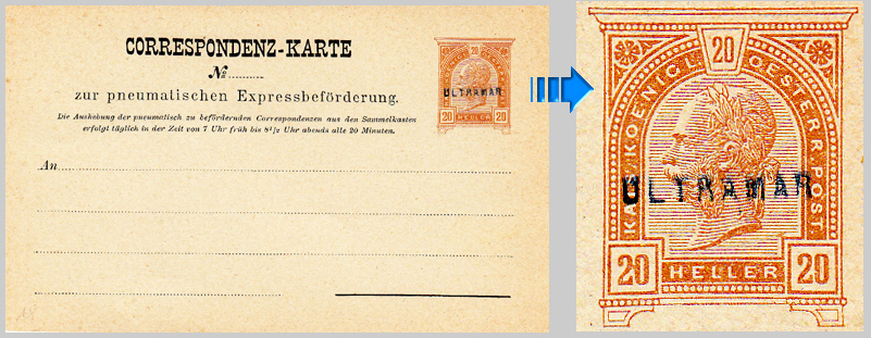 Rarely, items are found with an overprint "ULTRAMAR" in a "John Bull Printing Outfit" font. James Bendon in chapter 5 of his "UPU SPECIMEN STAMPS 1878–1961" explains that these are specimens sent by Austria to the UPU and onwards to Portugal. The Portuguese Post Office received 5 copies for each Portuguese Overseas Colony and applied this overprint. They then sent one copy to the colony but retained the other four in Lisbon; they were dispersed in the 1970s. "ULTRAMAR" is the Portuguese for Overseas, not for Specimen as sometimes suggested. For more information see "UPU SPECIMEN STAMPS 1878–1961", ISBN 978 1 870696 05 0 - a Complete Revision of the 1988 Edition. The publisher’s web site is www.oxfordbookprojects.co.uk/upubook