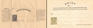 Special stationery was issued for the Pneumatic Post - letter sheets (1.3.1875), envelopes (1.3.1875), post cards (1.8.1879), and letter cards (2.10.1887). Because of the large number of items of stationery that were issued, the listing has been split into three sub-lists: Official Envelopes (Briefkuverts) and the letter-sheet (Faltbriefbogen); Official Letter Cards (Korrespondenzkarten); and Official Postcards (Kartenbriefe). To jump to one of these click the corresponding picture below the "bar of links".