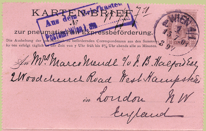 Next is a lettercard posted in 1901 and handled differently: it received a special explanatory boxed cancel "Aus dem Briefkasten / Postamt Wien 1 am {date & time}". That card was actually sent to London, for which the rate was 25H. The handwriting looks English - perhaps the sender hadn’t realised that red post-boxes in Austria weren't the same as those in London!
