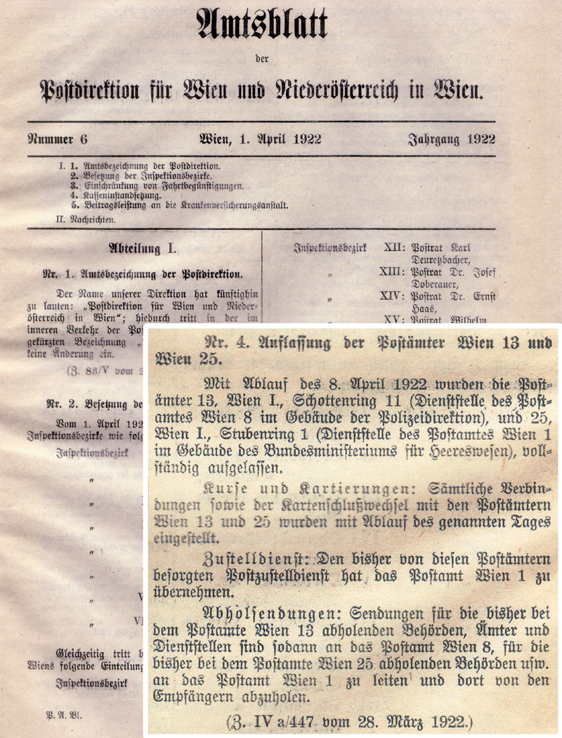 | "Amtsblatt der Postdirektion für Wien und Niederösterreich in Wien / Nummer 6 Wien, 1. April 1922 / Abteilung II / Nr 4. Auflassung der Postämter Wien 13 und Wien 25." Mit Ablauf des 8. April 1922 wurden die Postamter ... 25, Wien I, Stubenring 1 (Dienststelle des Postamtes Wien 1 im Gebaude des Bundesministeriums fur heereswesen) vollstandig aufgelassen. Kurse und Kartierungen: Sämtliche Verbindungen sowie der Kartenschlußwechsel mit den Postämtern Wien 13 und 25 wurden mit Ablauf des genannten Tages eingestellt. Zustelldienst: Den bisher von diesen Postämtern besorgten Postzustelldienst hat das Postamt Wien 1 zu übernehmen. Abholsendungen: Sendung ... für die bisher bei dem Postamte Wien 25 abholenden Behörden, Ämter und Dienststellen an das Postamt Wien 1 zu leiten und dort von den Empfängern abzuholen. (Z. IV a/447 vom 28. März 1922) |