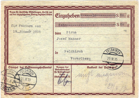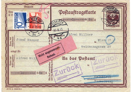 This Postauftragskarte is a request by Alfred Müllner in Vienna to J. Manner & Co in Feldkirch to pay 10Sch 80gr for an invoice dated 19 Jan 1935. This would be transacted at the Feldkirch post office. However Herr Manner refused; and Herr Müllner had to pay 15gr Vorzeigegebühr to have his card returned.