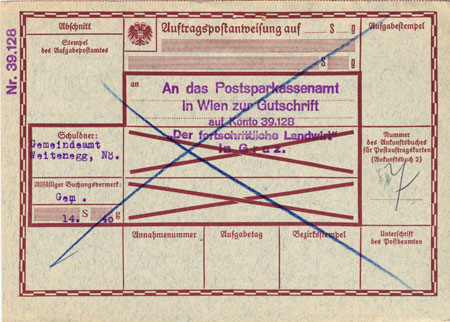 This is an Auftragspostanweisung, prepared so that the municipal authorities of Weidenegg could pay 14Sch40 into a Postsparkassen account to benefit "The Progressive Farmer" (probably a newspaper) in Graz. It’s unfranked and crossed out in blue so can’t have been used – although it could have been sent to Weidenegg in an envelope with a covering letter or invoice. Sometimes the rejected Postauftragskarte- Auftragspostanweisung pair were returned by the Post Office glued together; this shows the system to advantage but is difficult or impossible to make into an illustration!