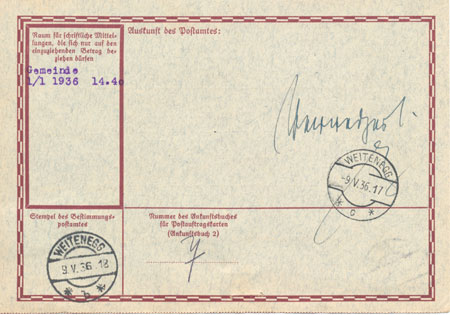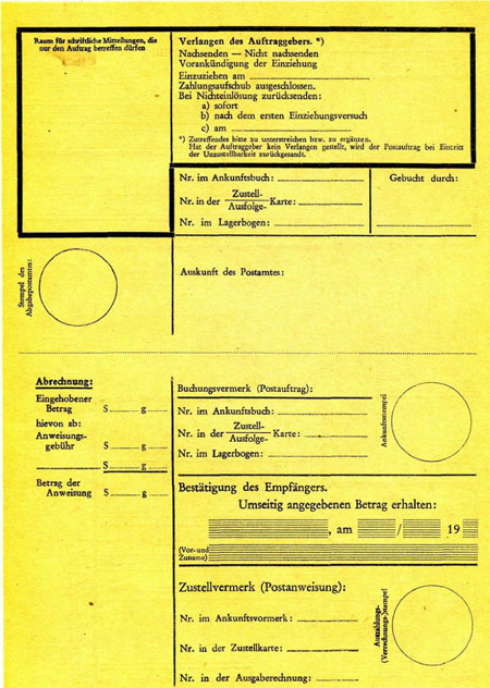 2. As I understand the system, the Postanweisung generated by a Postauftrag is handled the same way as one handed over the counter. It's an instruction to the money side of the Post Office (the Postsparkasse) to remit money to somebody. All such went via Otto Wagner's Postsparkasse building in Vienna, even if from Innsbruck to Igls. The form brought to the recipient’s door (that he couldn't have) was not the same form as the originator had filled in. Indeed, with later versions of the system whereby payments could be made from or to a named P.O. account, Vienna would certainly have kept the original as authorisation for shifting the money.