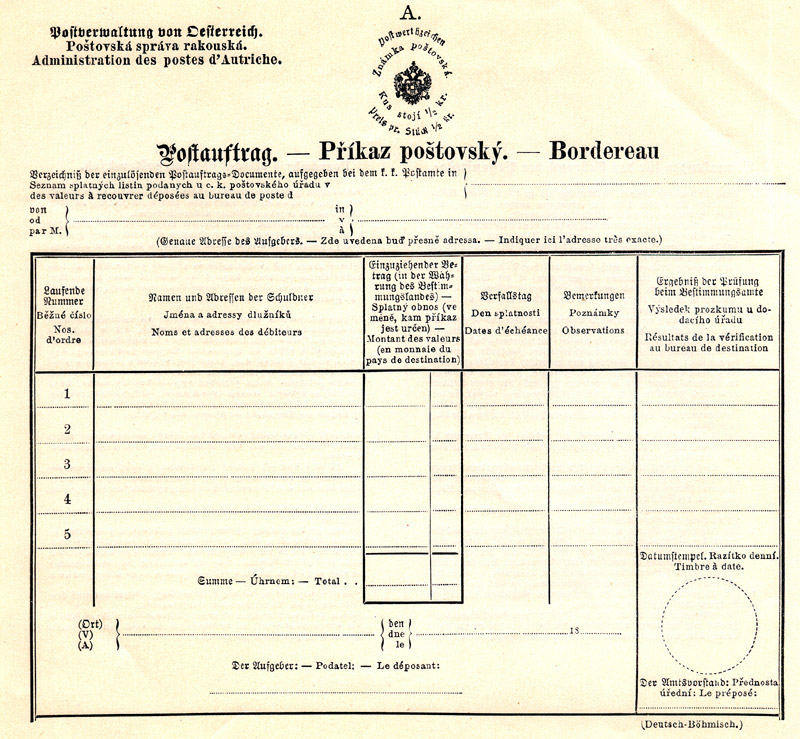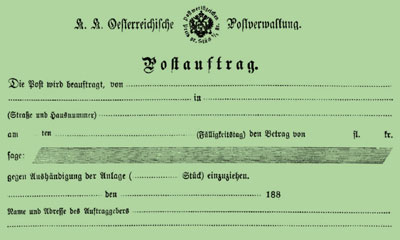 The new service is simplest to explain by an example. Let’s say that Bob wishes Alice to pay him 100 Gulden for something. Bob goes to a Post Office or a Stamp Reseller, buys a Postauftrag form for ½kr. and fills it in. He puts the form plus his supporting ‘Anlage’ (eg his invoice, bill of exchange, begging letter etc) in an envelope which he supplies; he decides if he wants only one delivery attempt to be made (if yes, he writes "Sofort zurück" on the back of the Postauftrag form); he addresses the envelope to Alice’s Post Office [not to Alice; her details go on the form]; and he takes it to his own. They check the details and enter them in their registers; and sell him adhesives to cover postage plus registration. These are applied to Bob’s envelope which is then transmitted to Alice’s Post Office as a registered letter. There were restrictions: