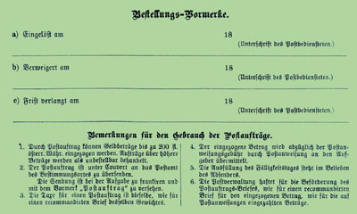 From 1 July [PVOBlatt 70 of 28 June] the sender was allowed to include a completed Postanweisung form in his envelope, instead of relying on the delivery office’s best efforts. He had to write "Auftrags-" before the title "Postanweisung". He was also permitted to add reference numbers, and could prepay the fee if he wished.