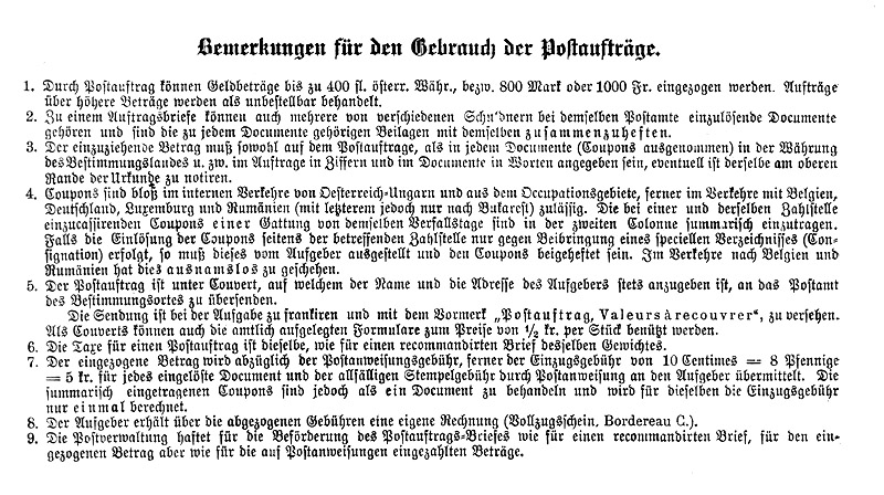 (and so on for 2½ pages plus a form). As was customary, the text of the Decree was repeated verbatim in a Postverordnung, Nr 84 dated 17 Oct 1882, with the addition that this new system would be publicised in the regional newspapers, and that the existing C.O.D. system remained unchanged. The Postverordnung was accompanied by three pages of Durchführungs-Bestimmungen giving explanatory details for the postal employees, and details of the reverse of the form and of the dual-language versions.