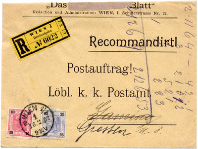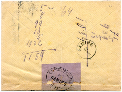 Sent in 1902 by a publisher in Vienna; franked with adhesives: 10kr post & 25kr registration. Redirected by the Gaming post office (whose stamp is on the resealing label) to Gossen – "contrary to 1902’s Regulations"!.