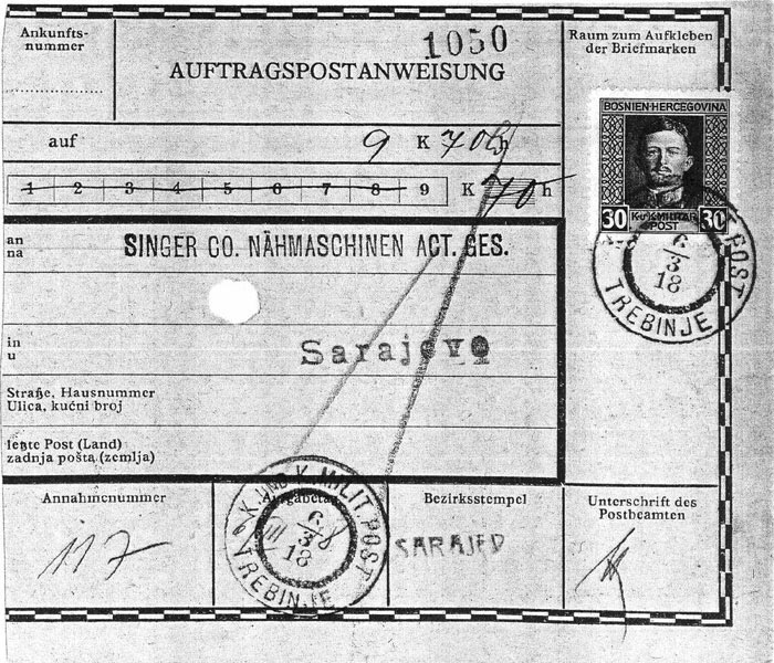 Money order, originally attached to a Postauftrag, sent from Trebinje on 6 Mar 1918, to Sarajevo. 20h fee + 10h for collection.