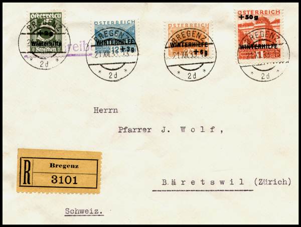 "Winterhilfe", issued 15.12.1933, valid until 30.4.1934 (high value), 10.11.1934 (lower values). ANK 563-566. 1925-30 issues in changed colours and overprinted with a surcharge for winter relief (5+2, 12+3, 24+6, 1S+50). Oddly, the high value was printed in smaller quantities, and only available at selected Post Offices as part of a set; the lower values were on sale everywhere.