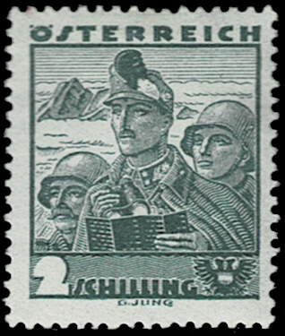 ![]() | 2S. An army officer and two soldiers of the Kaiserschützen Regiment of the Tirol with a typical Tirolese background. The officer carries a map and a pair of field glasses. Dollfuss served in this regiment of "Tirol Rifles" throughout World War I. The original grey-green stamp (left) has a larger eagle with five feathers; only 87,600 were printed. The later emerald stamp (right) has the same design but has a smaller eagle with seven feathers. Some 'grey-green' stamps are chemically-changed 'emerald' stamps - count the feathers! | ![]() |