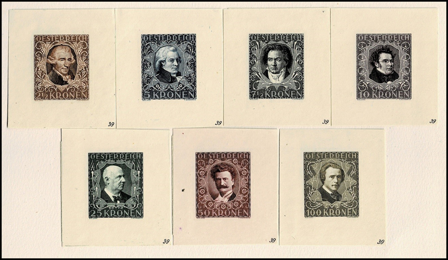 During the disheartening period after the First World War the Austrian Post Office started to issue sets of Charity stamps to raise funds for categories of needy persons. These stamps usually consisted of a beautiful portrait or view contained in an elaborately designed decorative frame; a tradition which started in 1908 and which continued into the Second Republic. The first of these sets appeared on 24 April 1922 and depicted seven famous Austrian composers. (OK, Beethoven was born in Bonn and Mozart in the then independent country of Salzburg.)