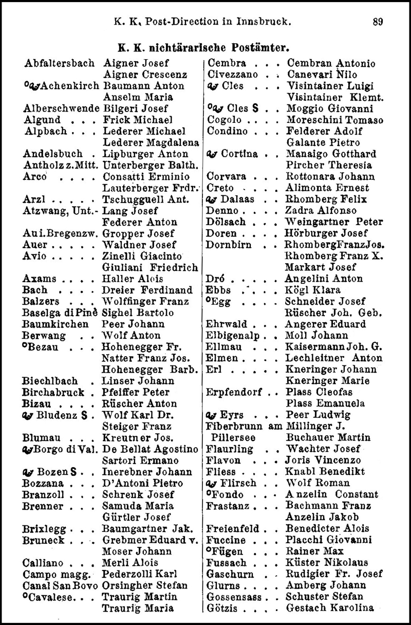 The 1881 Post-Almanach is 105x140 mm with 173 pages. This page from the 1881 issue is part of the listing of "k. k. nicht-ärarische" (ie privately owned and run) Post Offices in the Postdirektion Innsbruck’s area. And this is the 1881 "k. k. ärarische" (ie state-owned and run) offices.
