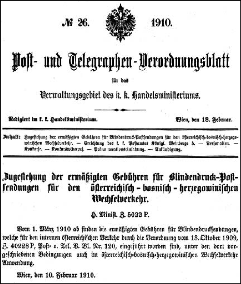 Here are the Verordnung des Handelsministeriums of 13 October 1909 giving the details of a rate reduction for Braille items in the inland post; and a subsequent Verordnungsblatt of 1910, extending it to Bosnia-Herzegowina. As the Verordnung des Handelsministeriums is dated 13 October 1909, was published on 31 October, and came into effect on the 1st of November, ie the day after publication, it is unclear how the postal staff knew in time. This oddity is quite often found, and remains without factual explanation.
