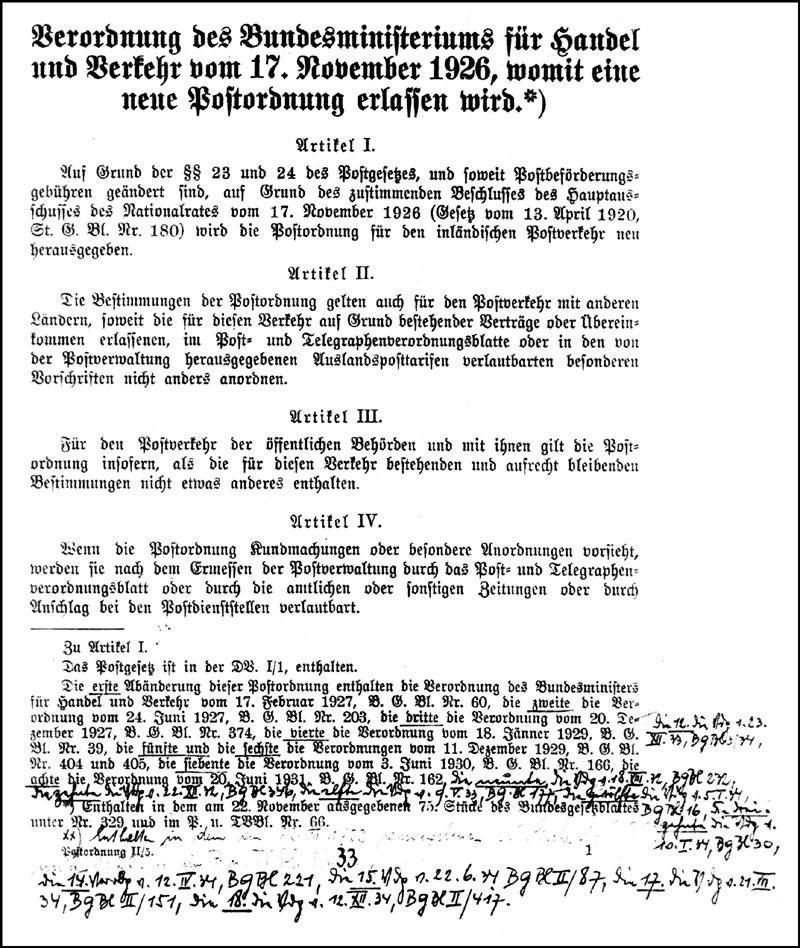 It seems that in 1931 the 1926 Postordnung was reprinted (perhaps for internal use only) in a version incorporating all the intervening amendments; see the discussion below under "Dienstvorschrift". Further amendments appeared until the Anschluss. Careful cross-checking of the text shows that (for the 1926 issue at least) each amendment applies to the Postordnung as previously amended; ie they are cumulative. That means that a researcher who misses an amendment will fall into error.