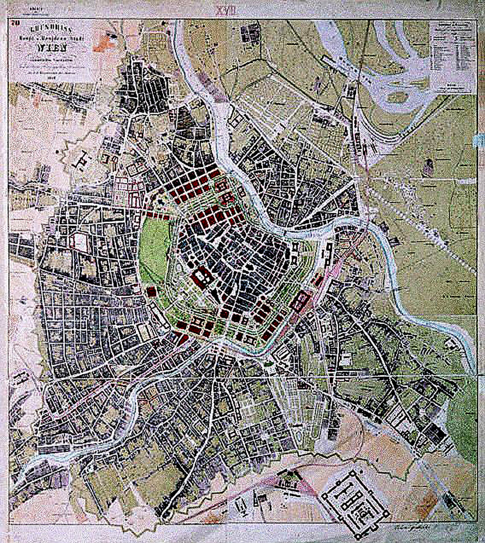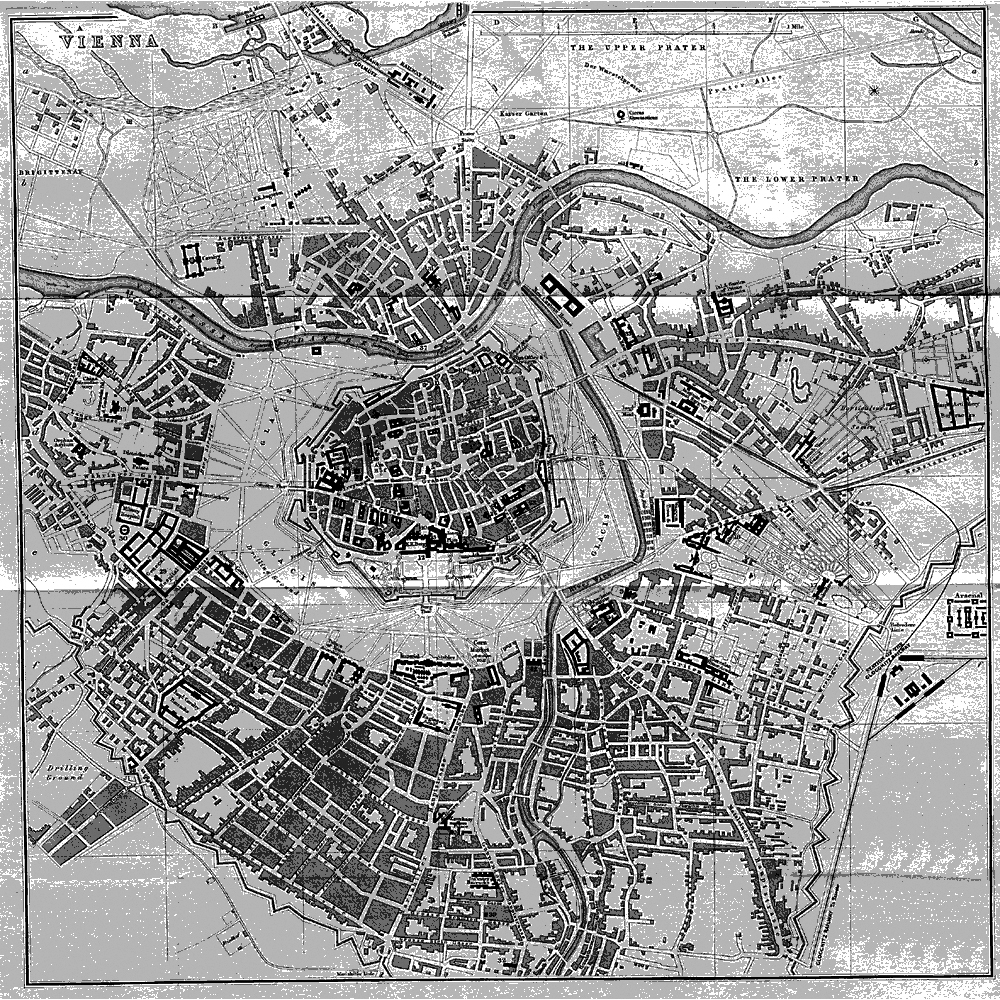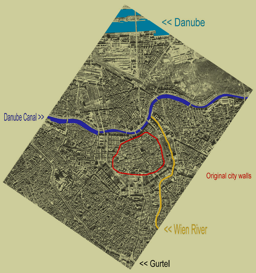 Vienna in 1850 consisted of the old city surrounded and hemmed in by fortifications and a military glacis, which separated it from a surrounding and ever-expanding fringe of suburbs (and vineyards!). This is shown clearly on a map of 1858 (found on the Internet). Note what became the Danube Canal above the city, the open Wiener Fluss (Vienna River), the channels of the Danube at the top, and the jagged line of the outer fortification walls (Linienwälle) which are today's Gürtel. The street heading to the bottom right is Wiedner Haupstrasse. The large dark building at the 'bottom' of the inner city is the Hofburg; directly facing it through the Burgtor and across the glacis are the Imperial Stables, now the Museum-Quarter. The map points roughly north-east.