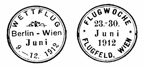 The official opening of the airport took place simultaneously with the International Aviation week in Vienna from June 23 to June 30, 1912. The description 'International' was well justified, with more than half of the 44 participants coming from abroad, eg France, Germany, Italy, Rumania, Russia, Switzerland and even from Peru. However, a substantial portion of the quite generous prizes went to Austrian aviators. The factors for judgement included altitude, speed, ascent, circling and landing. There was a first prize for 4300 meter altitude with one passenger: or 201.8 km distance. Austria scored 23 world records and finished closely behind France and well ahead of the USA and Germany. The cancel illustrated is from the special exhibition post office.
