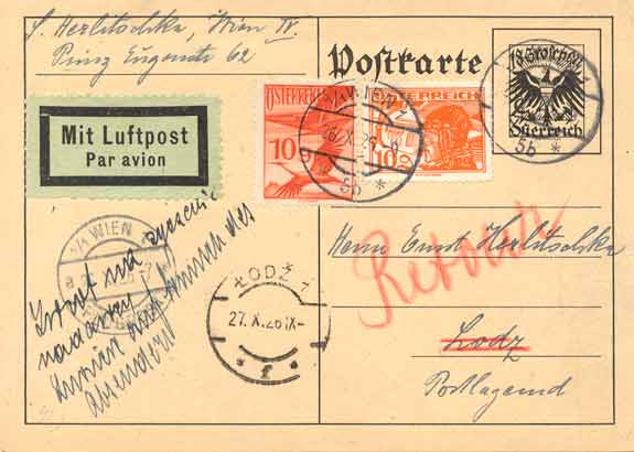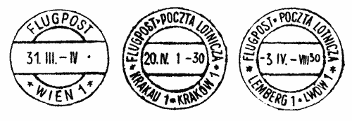 Stamps, as well as airmail stamps necessary for the surcharge attached to these letters or postcards, were cancelled in the usual manner at the originating post office. In addition thereto, after March 31 1918, the airmail agents in Vienna, Krakow and Lemberg added their own cancel without considering whether the item was in fact transported by air or by other means. This cancel was applied by the agent in the originating office on the front of the letter and by the agent for the receiving office on the back of the letter. Postcards received both cancels on the address side of the postcard. Only on March 26th 1938, after Austria's annexation by Germany, were these cancels discontinued and replaced with regular cancels.