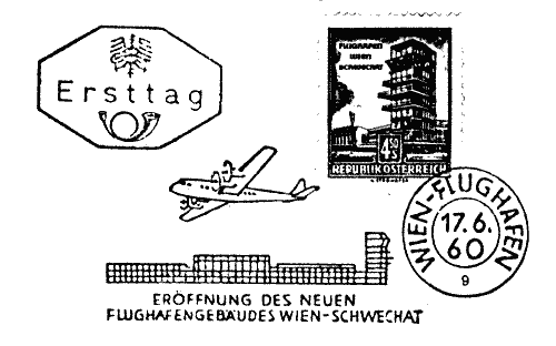 Building of the new airport Vienna-Schwechat had begun in 1955, and on 17 June 1960 it was opened by President Adolf Shärf. It had the most modern arrangements and was designed for the transport of 2 million passengers per year. Today little of the original buildings remain, as since the 1970s air traffic has grown like an avalanche, and the Vienna airport has expanded constantly and generously. In 1988 there were 4.6 million passengers, in 1998 10.6 million. From about 4,000 flight movements in 1956 the traffic has grown to 66,843 in 1988 and to 165,242 in 1998. Today (1998) the airfield has 400,000msq runways, 514,000msq taxiways, 674,000msq aprons and 578,000msq roads, footpaths and parking places. Its post office was opened on 17/4/1956; below is a first day cancel.