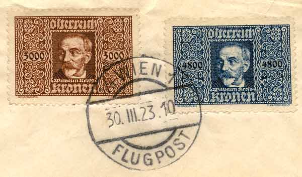 With the largely regained freedom in civilian, and consequently also in postal areas, the founding of an Austrian Aviation company (Österreichische Luftverkehrs AG or ÖLAG) became possible, which started operations on May 14 on the Vienna-Munich route. The first transportation of airmail to Munich occurred on May 22 1923. The airplanes did not start or land in Aspern, but used the waters of the Danube near Jedlesee. With an extension to Budapest, where no suitable airfield could be found, it was the only way to service both. The first airmail to Budapest was flown on July 16th 1923.