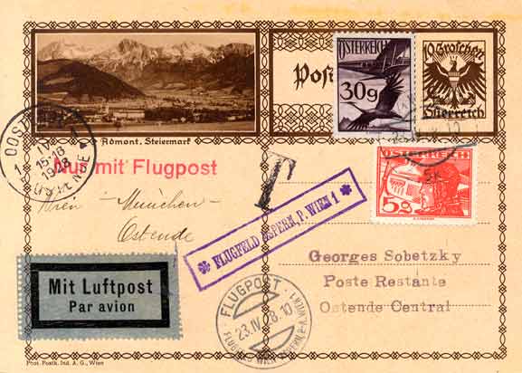As well as the FLUGPOST cancel, the post office had a violet Postablage cancel, known used from 1926 until June 1928 [Kühnel 257]. Both cancels appear on the first illustration below, which is of a card flown on the first Vienna-Ostend-Antwerp flight.