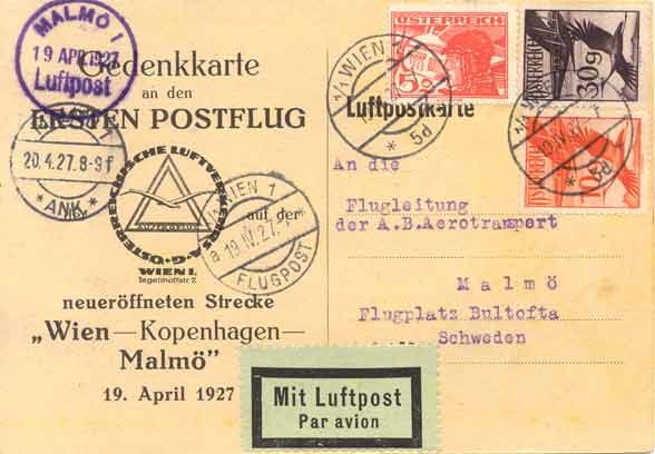 Flight to Malmö in Sweden (19.4.1927): the triangular cachet is ÖLAG