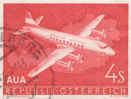 On 31 March 1958, the first flights to London began, using four Vickers Viscounts, rented from the Norwegian Fred Olsens Flyselskap with Norwegian pilots and Austrian stewardesses. The occupacity was an inadequate 25%, ie 12 passengers per flight, and from then on the AUA made only losses, becoming bankrupt in 1962. The management, which had been party representatives in due proportion, was totally replaced with experts (naturally again in proportional representation, the staff reduced and new, jet-propelled aircraft obtained. In 1972 AUA made their first profit, and since then have developed the red-white-red fleet into a renowned international airline.