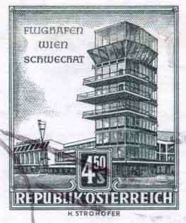 Until the State Treaty, civilian air traffic used the former military airfields Schwechat-Heidefeld, Vöslau-Kottingbrunn and Tulln-Langenlebarn. Aspern as the Soviet military airfield was completely ruled out. The situation and size of Schwechat made it the only useful airfield for the future, besides which the British had left it in operable condition. This stamp [ANK1109; 17.6.1960] shows the control tower.