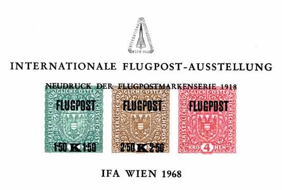 In 1968, the International Airmail Exhibition was held in Vienna; three stamps were issued [ANK1292-4] depicting aeroplanes - the 2ATS is the Etrich Dove: see 'The Planes'. In addition, the 1918 overprinted stamps were reprinted in changed colours (green, brown, red) and issued as a souvenir sheet without postal validity.