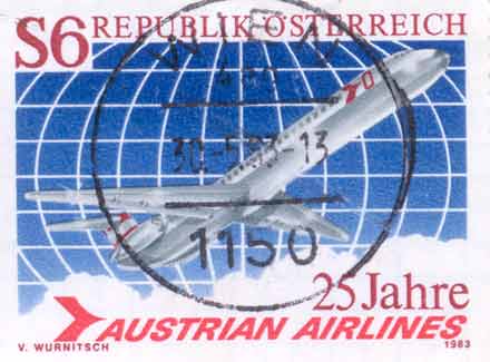 This stamp [ANK1765] was issued on 31.3.1983 to commemmorate the 55th anniversary of the first international airmail service (Vienna-Kiev); the 50th anniversary of Austrian Aviation Corporation; and the 25th anniversary of Austrian Airlines.